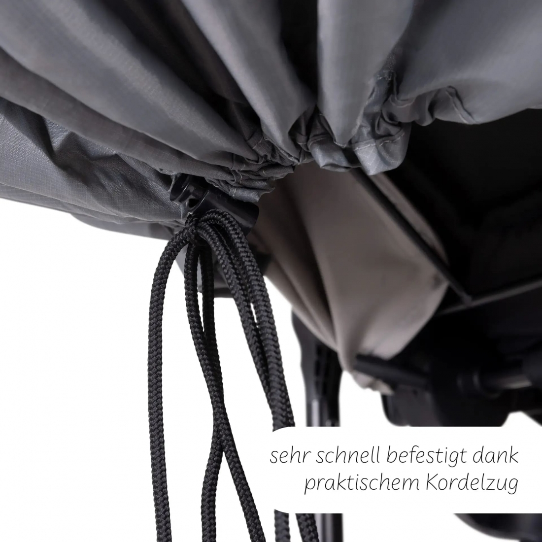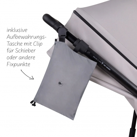 L’habillage pluie 4 Seasons Pram se fixe rapidement à la nacelle ou au siège sport grâce à un cordon flexible. Il est livré avec un sac de transport pratique que vous pouvez fixer au châssis, afin d’avoir toujours votre protection contre la pluie à portée de main. La capote pare-soleil de la poussette reste fonctionnelle même avec l’habillage installé.