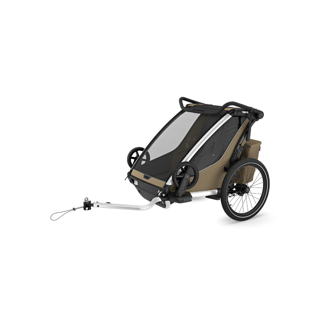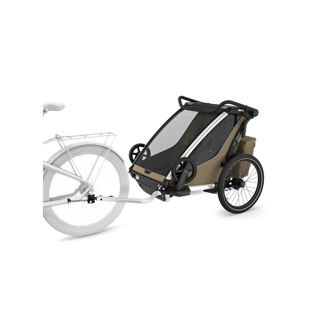 Les sièges entièrement rembourrés et inclinables d’une seule main permettent aux enfants de faire la sieste confortablement. Le système FlipWing repensé facilite le passage du vélo à la marche. Le bras d’attelage se fixe et se détache d’une seule main. La suspension réglable assure un confort de conduite personnalisé, et l’espace de chargement XL avec fermeture à glissière offre un rangement sûr pour vos affaires. Le mécanisme de pliage compact rend le transport facile, et les évents d'aération optimisent la circulation d’air et le contrôle de la température.