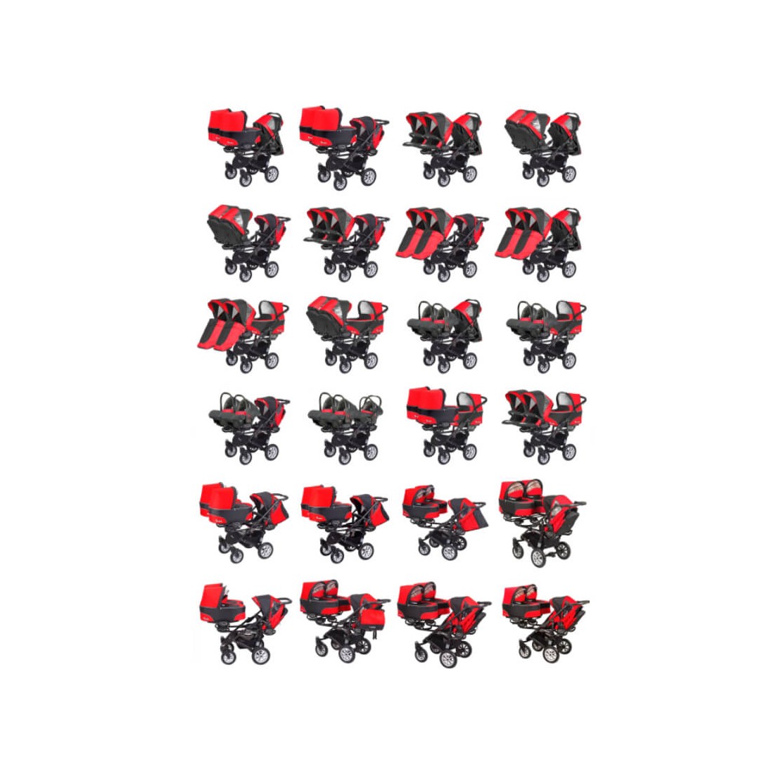 Ce pack comprend la poussette triple Trippy premium, 3 nacelles et 3 coques assorties ainsi que les adaptateurs nécessaires.