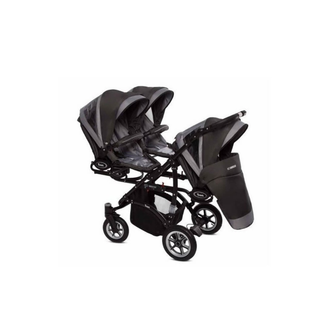 La poussette triple Trippy vous permet de vous balader aisément avec vos triplés ou enfants d'âges rapprochés.