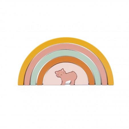 Les enfants pourront s'amuser à empiler les arcs colorés, créer des parcours d'équilibre, faire glisser le petit lion le long des courbes ou inventer des histoires avec les deux adorables chats inclus.