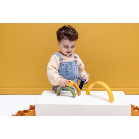 Les enfants pourront s'amuser à empiler les arcs colorés, créer des parcours d'équilibre, faire glisser le petit lion le long des courbes ou inventer des histoires avec les deux adorables lions inclus.