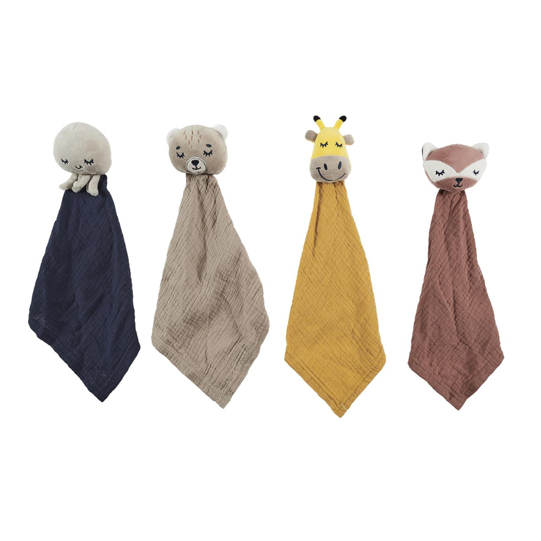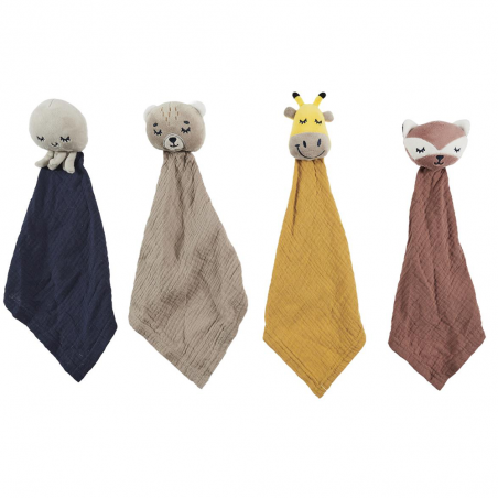 Le doudou mouchoir animal en coton : Ourson, Poulpe, Girafe ou Biche (20x20 cm)