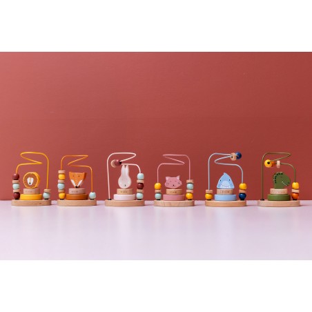 Ce joli jouet en bois aidera votre enfant à développer sa réflexion en faisant glisser les petites perles colorées sur le labyrinthe en métal et en recréant le petit animal avec les anneaux.