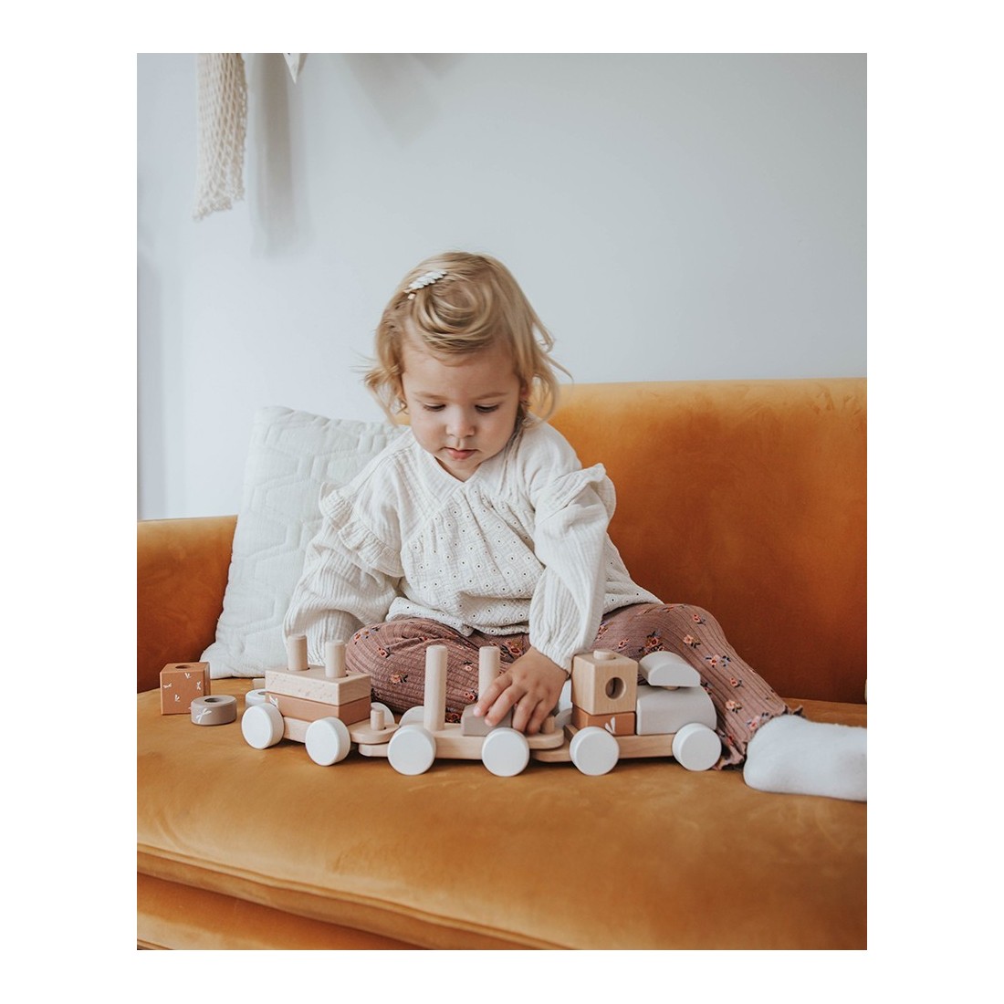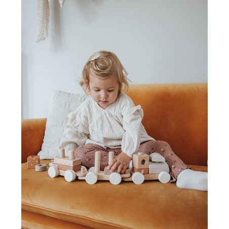 Lorsque votre enfant sera un peu plus grand, à l’occasion de son premier anniversaire, ce train deviendra un excellent jeu pour développer sa motricité fine. Ce jouet en bois l’aidera également à améliorer sa coordination main-œil. En effet, il pourra manipuler les 14 éléments colorés du train et devra s'appliquer pour remettre les blocs en bois sur les wagons.