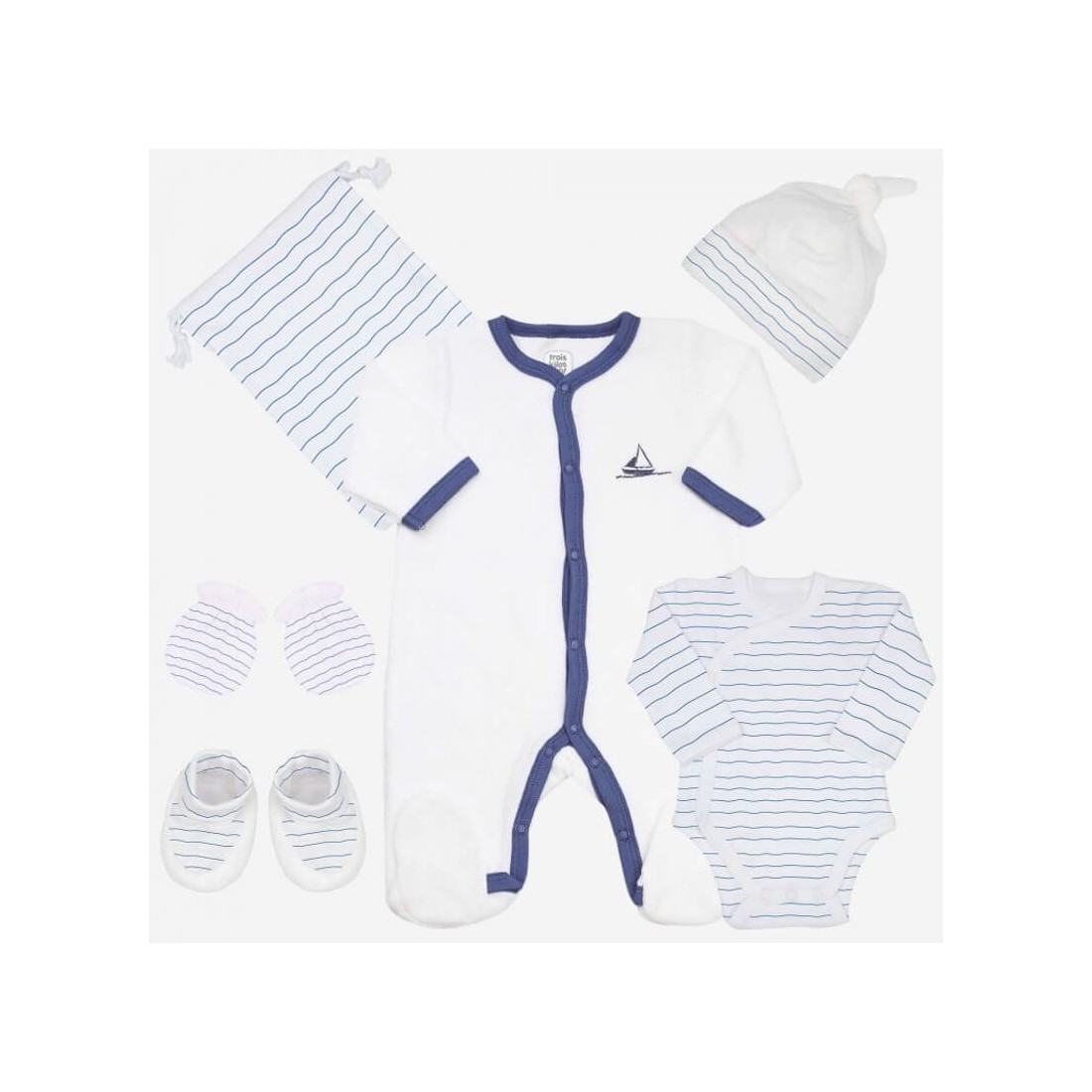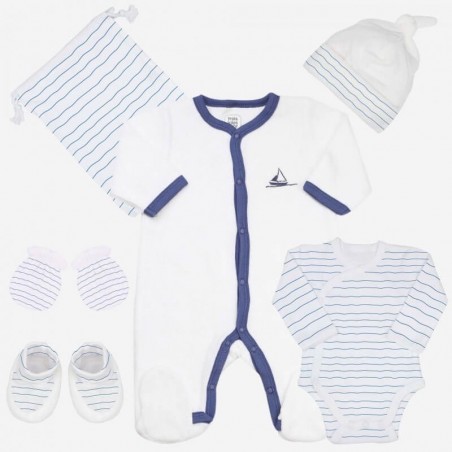 Le kit de naissance Rayé de Trois Kilos Sept est composé d'un pyjama dors bien Y, d'un body croisé, d'une paire de chaussons, d'un bonnet en velours, de gants fins et d'une pochette en tissu pour y ranger la tenue à l'intérieur.