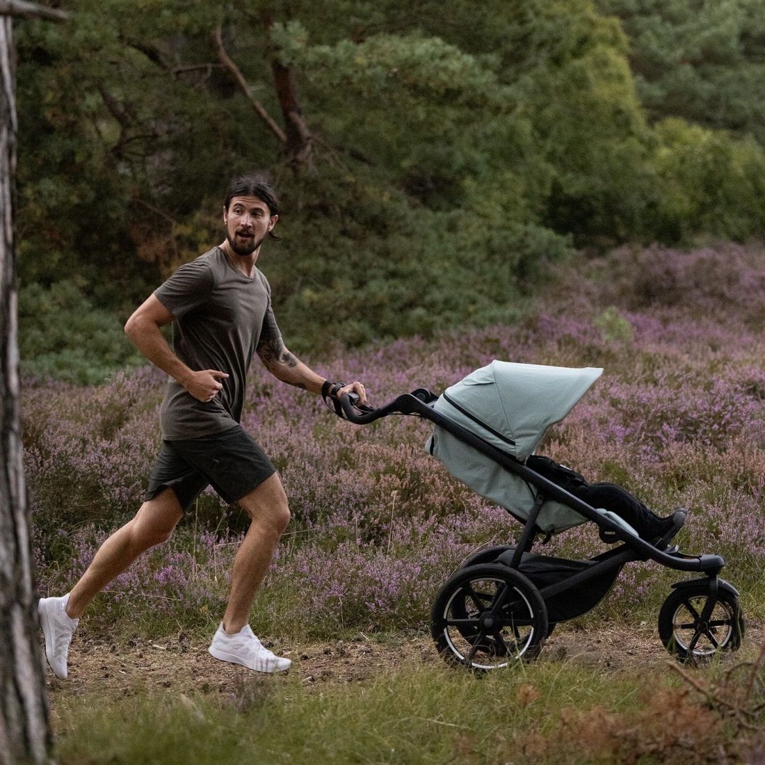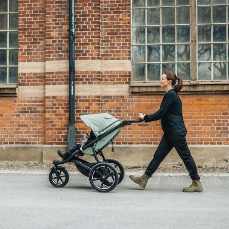 Celle-ci est légère ce qui lui confère une parfaite maniabilité à l'aide de sa roue avant pivotante qui a un système de sécurité intégré. En effet elle se verrouille lorsque la poussette prend trop de vitesse. Ses roues arrières sont quant à elles très larges et sont prêtes pour affronter tous les chemins que vous emprunterez.