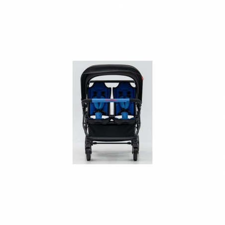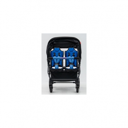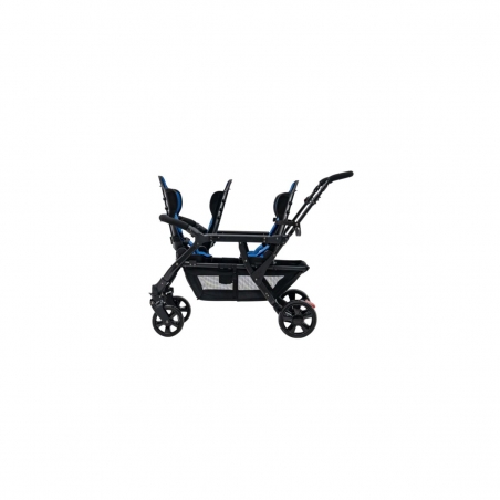 Les assises sont homologuées pour accueillir deux enfants à l’avant et deux à l’arrière, jusqu’à 15 kg chacun, conformément à la norme européenne EN 1888-12. Les roues EVA avec amortisseurs à l’avant et le frein à pied verrouillable assurent une conduite souple et sécurisée.