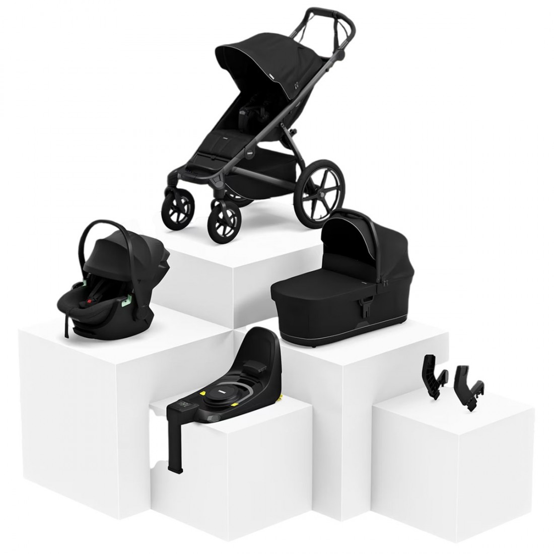 Ce pack comprend : Poussette Thule Urban Glide 4 roues (noir) + nacelle Thule (noir) + base ISOFIX Thule Alfi + siège auto bébé Thule Maple (noir) + adaptateur siège auto Thule Urban Glide 3 pour Maxi-Cosi®.