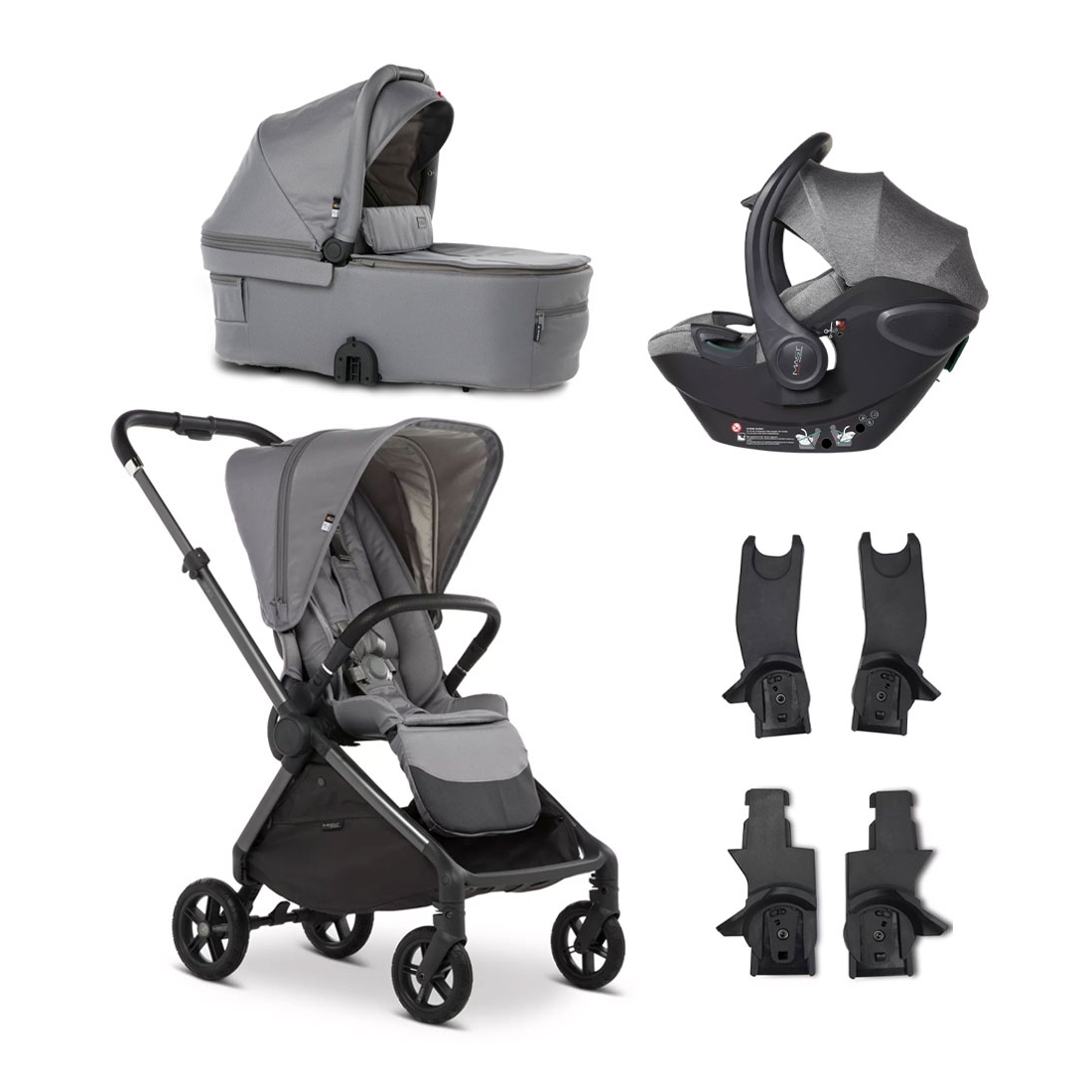Ensemble complet prêt à l’emploi : poussette, nacelle, coque et adaptateurs inclus.