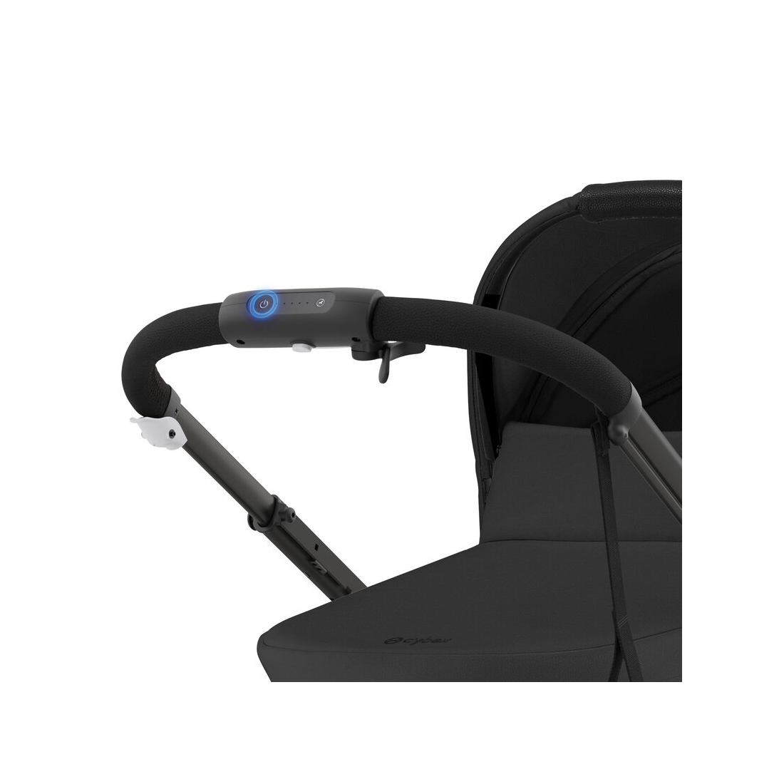 L’interface utilisateur intégrée dans la poignée permet de contrôler la vitesse via un levier intuitif, régler l’intensité du mode bercement, vérifier l’autonomie de la batterie et allumer ou éteindre la poussette facilement. Un véritable atout pour des balades fluides et sans effort.