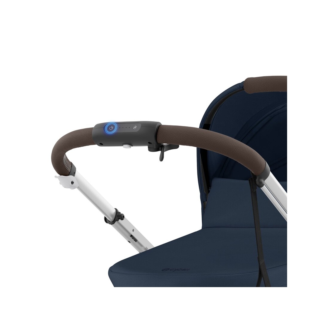 L’interface utilisateur intégrée dans la poignée permet de contrôler la vitesse via un levier intuitif, régler l’intensité du mode bercement, vérifier l’autonomie de la batterie et allumer ou éteindre la poussette facilement. Un véritable atout pour des balades fluides et sans effort.