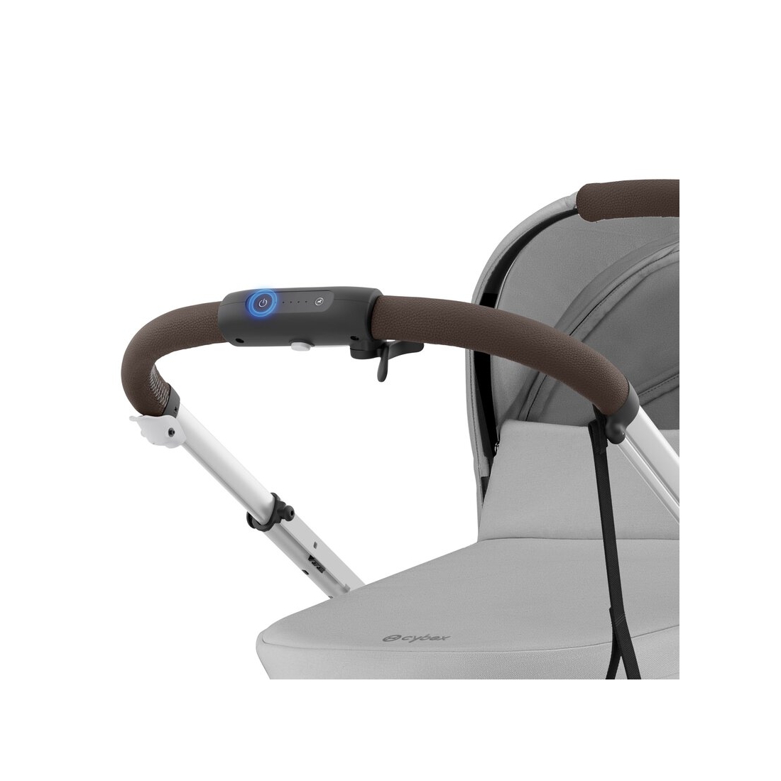 L’interface utilisateur intégrée dans la poignée permet de contrôler la vitesse via un levier intuitif, régler l’intensité du mode bercement, vérifier l’autonomie de la batterie et allumer ou éteindre la poussette facilement. Un véritable atout pour des balades fluides et sans effort.