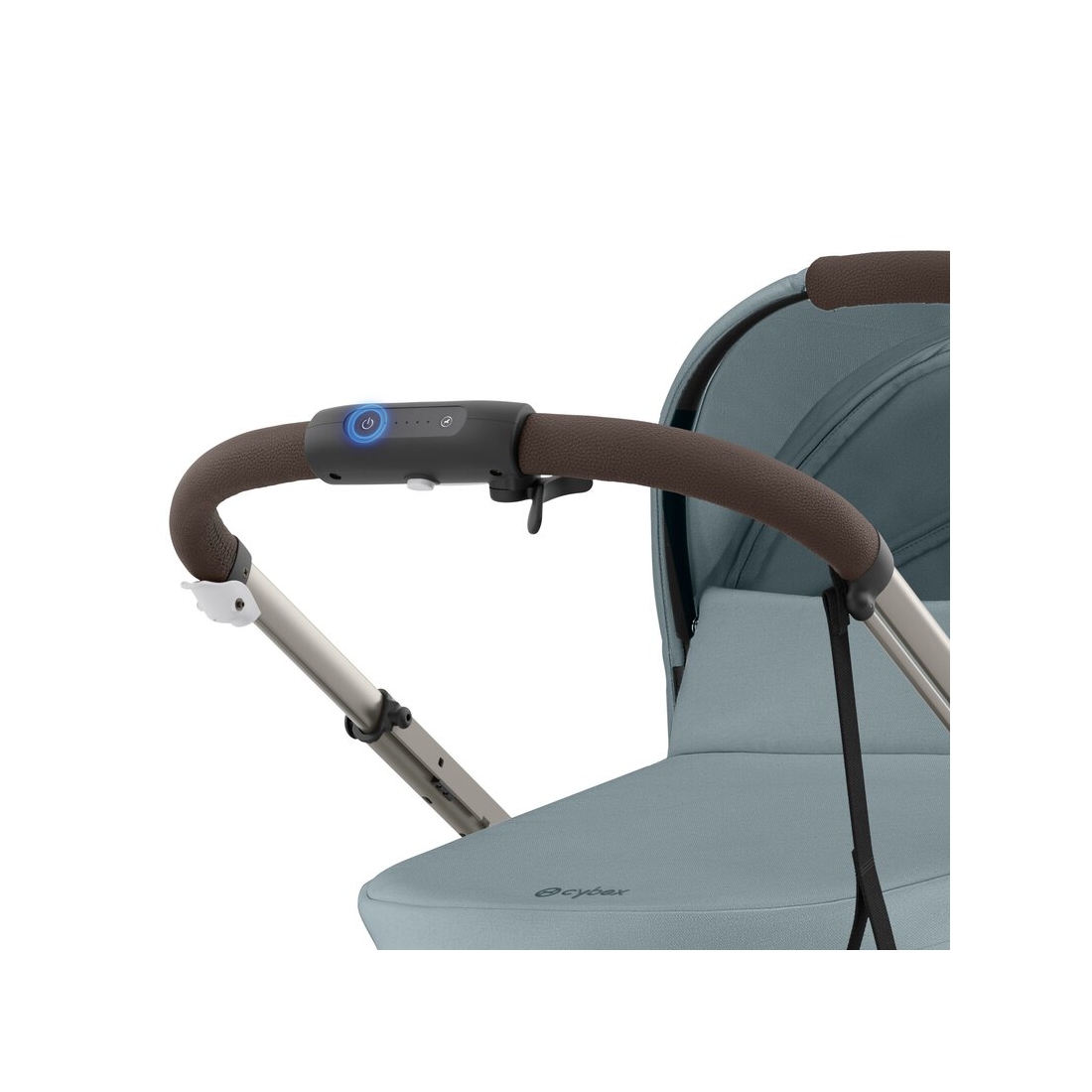L’interface utilisateur intégrée dans la poignée permet de contrôler la vitesse via un levier intuitif, régler l’intensité du mode bercement, vérifier l’autonomie de la batterie et allumer ou éteindre la poussette facilement. Un véritable atout pour des balades fluides et sans effort.