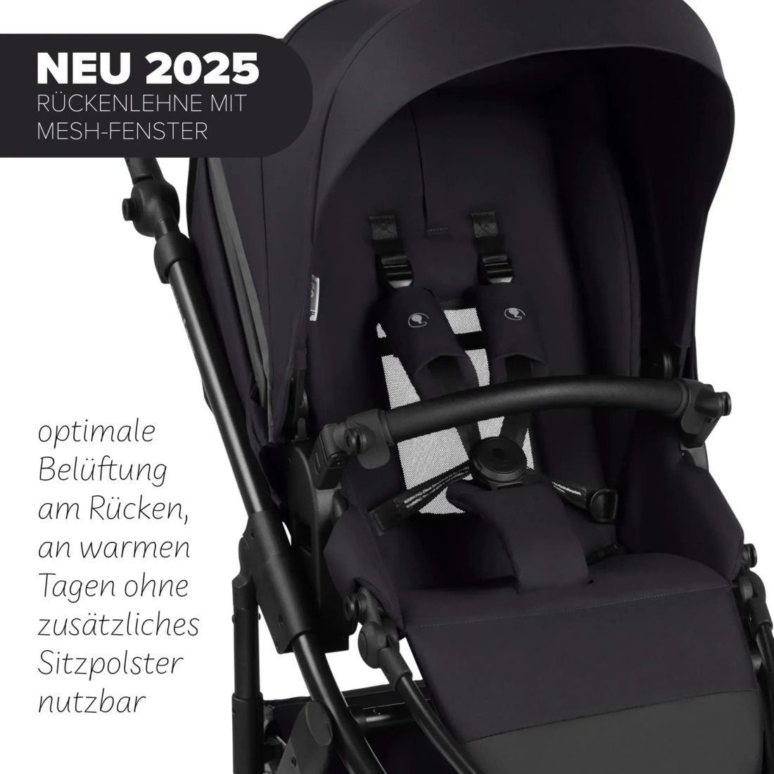 Pour assurer une bonne circulation de l’air, la poussette intègre deux fenêtres d’aération en tissu mesh situées dans la canopy et dans le dossier.