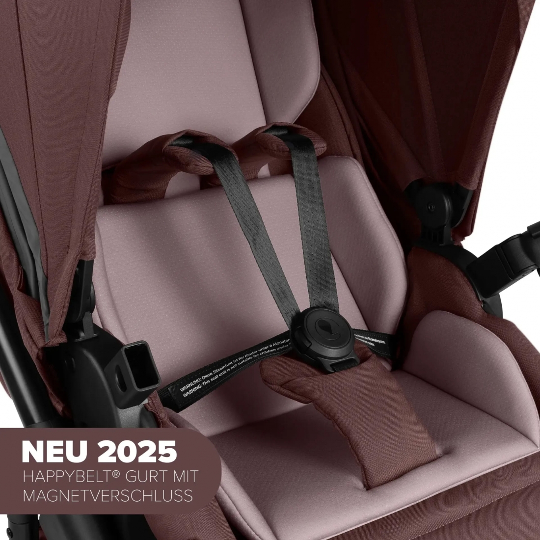 Un insert de siège ergonomique apporte un soutien supplémentaire, tandis que le harnais de sécurité 5 points HappyBelt® avec fermeture magnétique garantit un maintien sûr et facile à ajuster.