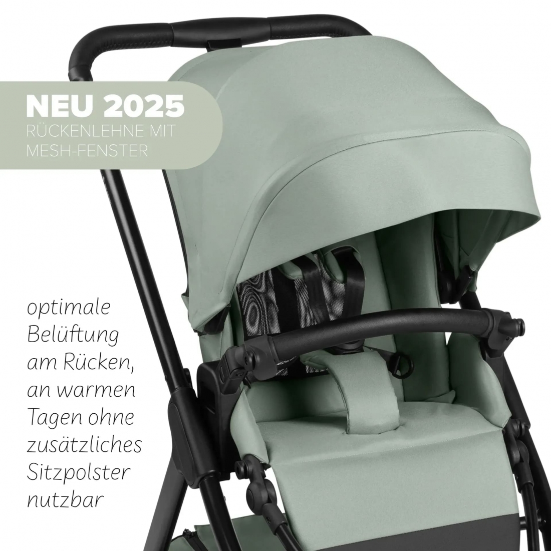 Des fenêtres d’aération en mesh intégrées au dossier et à la capote assurent une bonne circulation de l’air.
