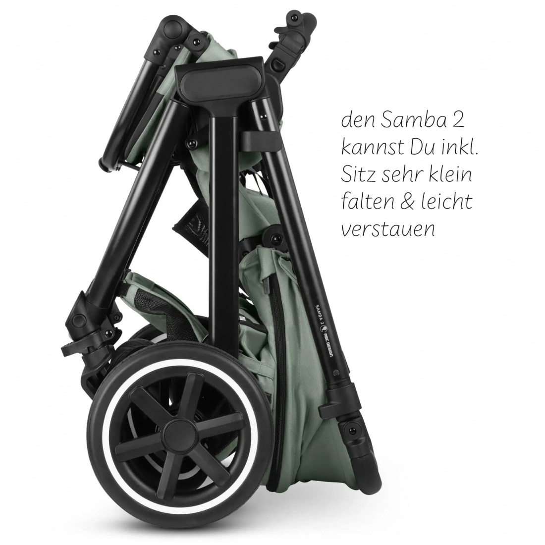 La Samba 2 se plie rapidement grâce au système FlexiFold, permettant de réduire la poussette à une taille compacte quel que soit le sens du siège (face parent ou face route).