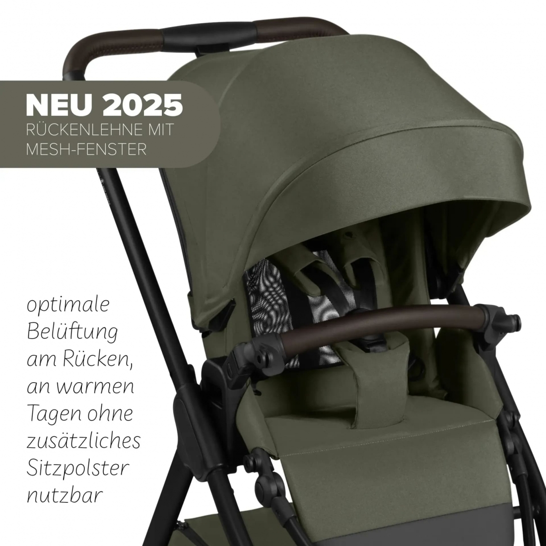 Des fenêtres d’aération en mesh intégrées au dossier et à la capote assurent une bonne circulation de l’air.