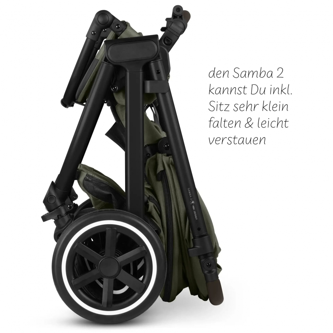 La Samba 2 se plie rapidement grâce au système FlexiFold, permettant de réduire la poussette à une taille compacte quel que soit le sens du siège (face parent ou face route).