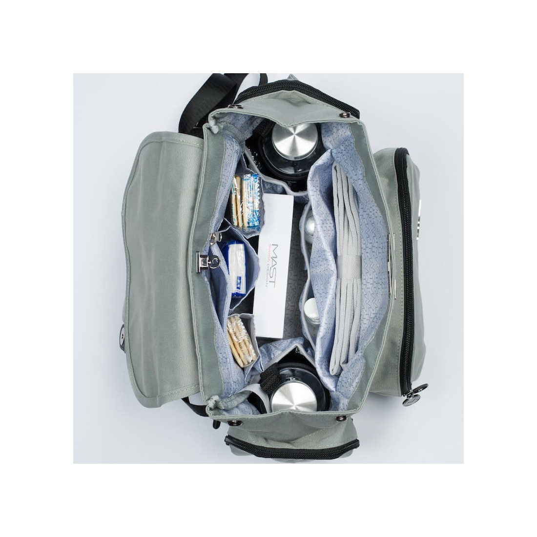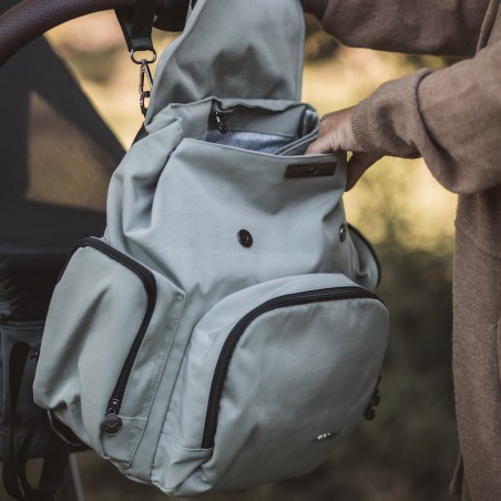 Le sac à langer Classy de Mast Swiss Design est à la fois tendance, élégant et pratique. Il se porte sur le dos ou bien il s'accroche sur la poussette grâce à ses deux sangles situées à l'arrière du sac.