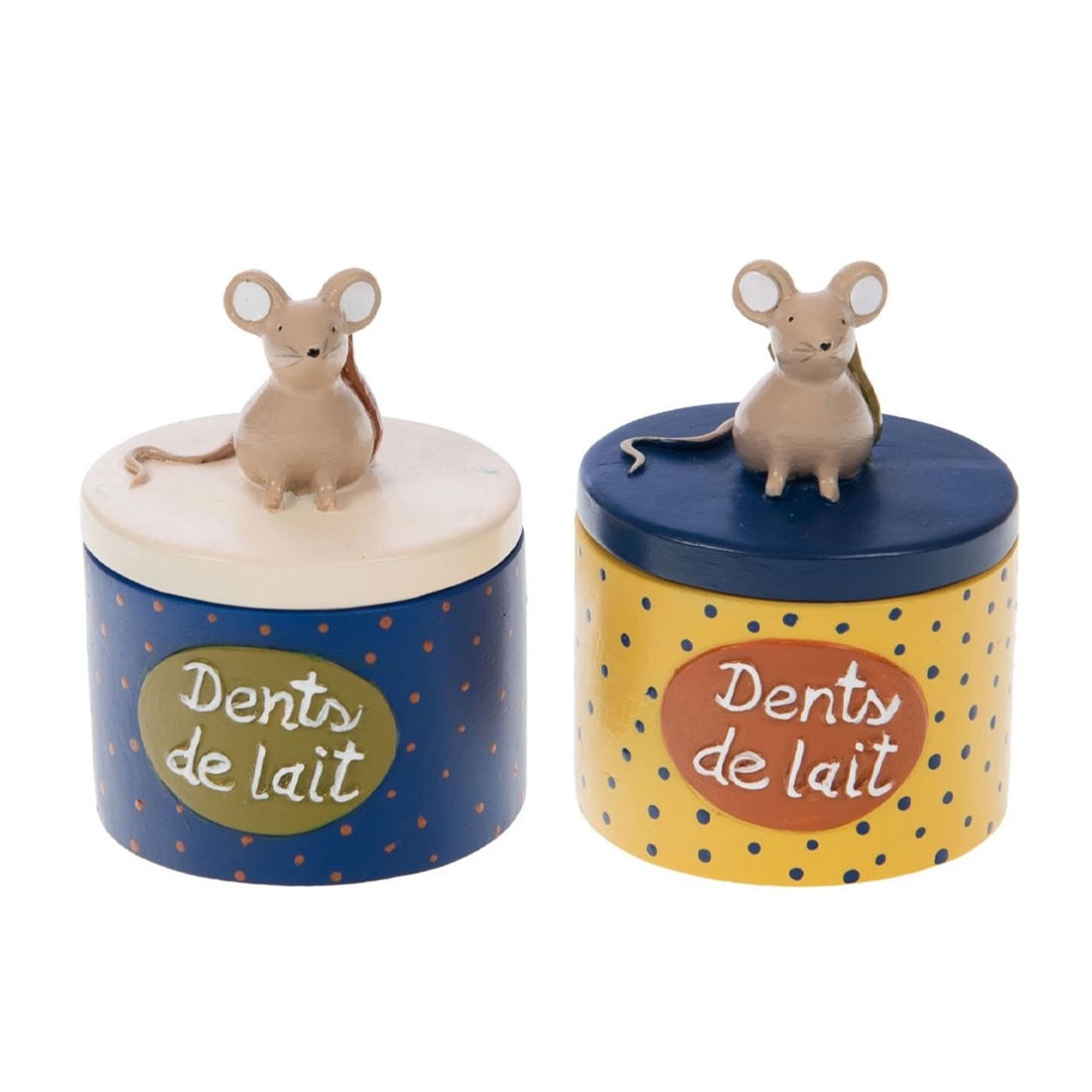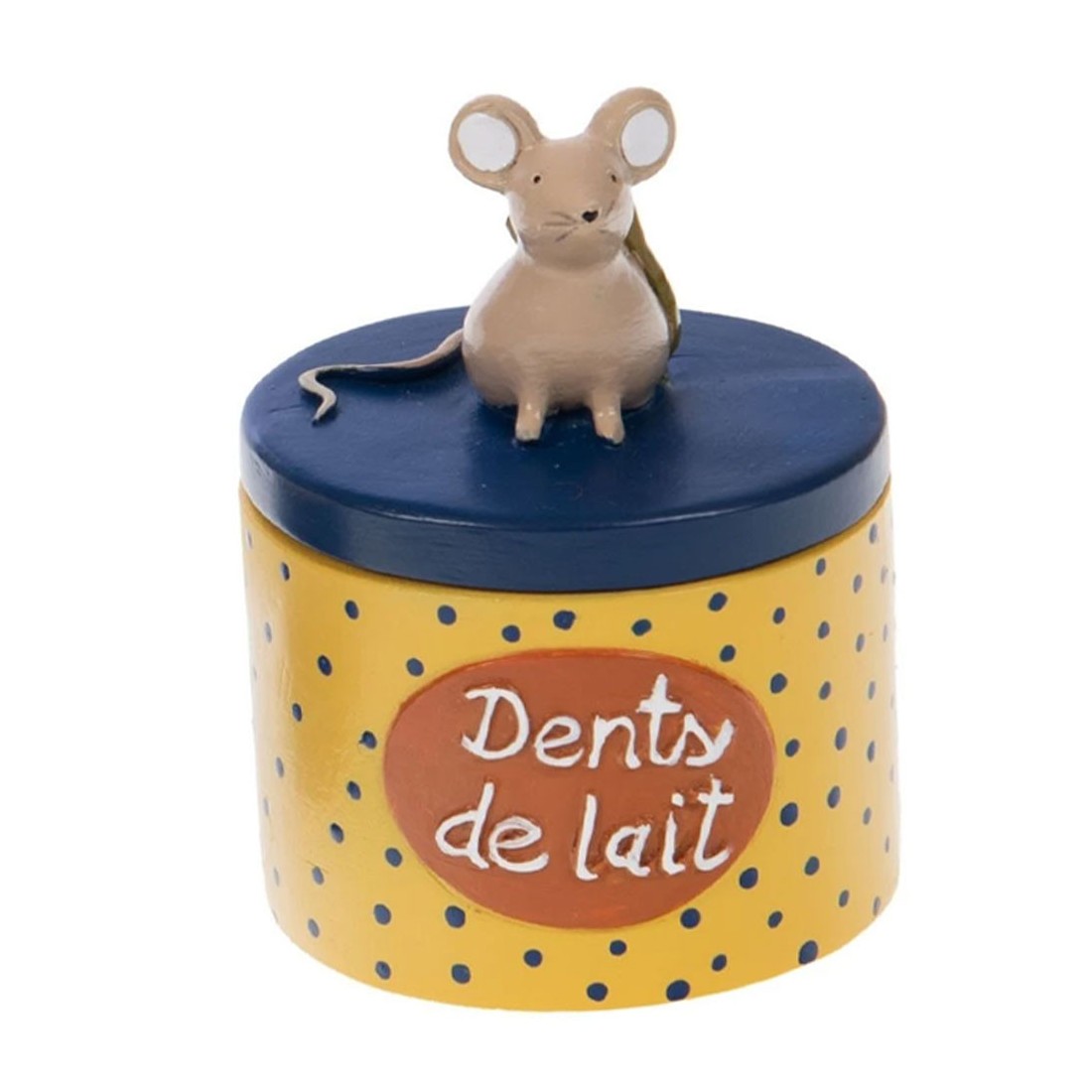 Sur la première face de la boîte, l’inscription “Dents de lait” rappelle sa fonction. Le couvercle est décoré d’une adorable figurine de petite souris, apportant une touche charmante et ludique à cet objet.
