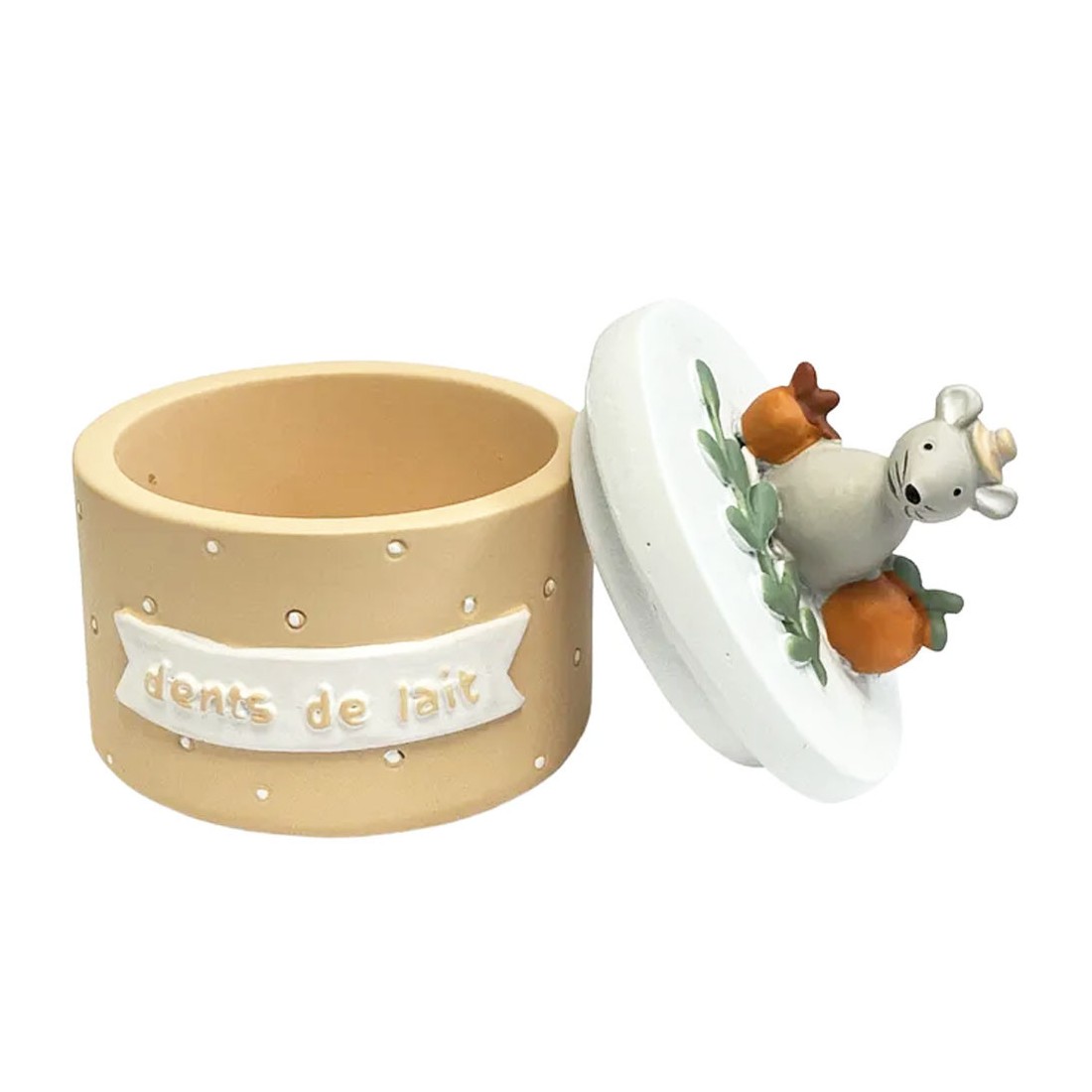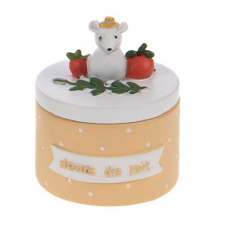 Sur la première face de la boîte, l’inscription “Dents de lait” rappelle sa fonction. Le couvercle est décoré d’une adorable figurine de petite souris, apportant une touche charmante et ludique à cet objet.