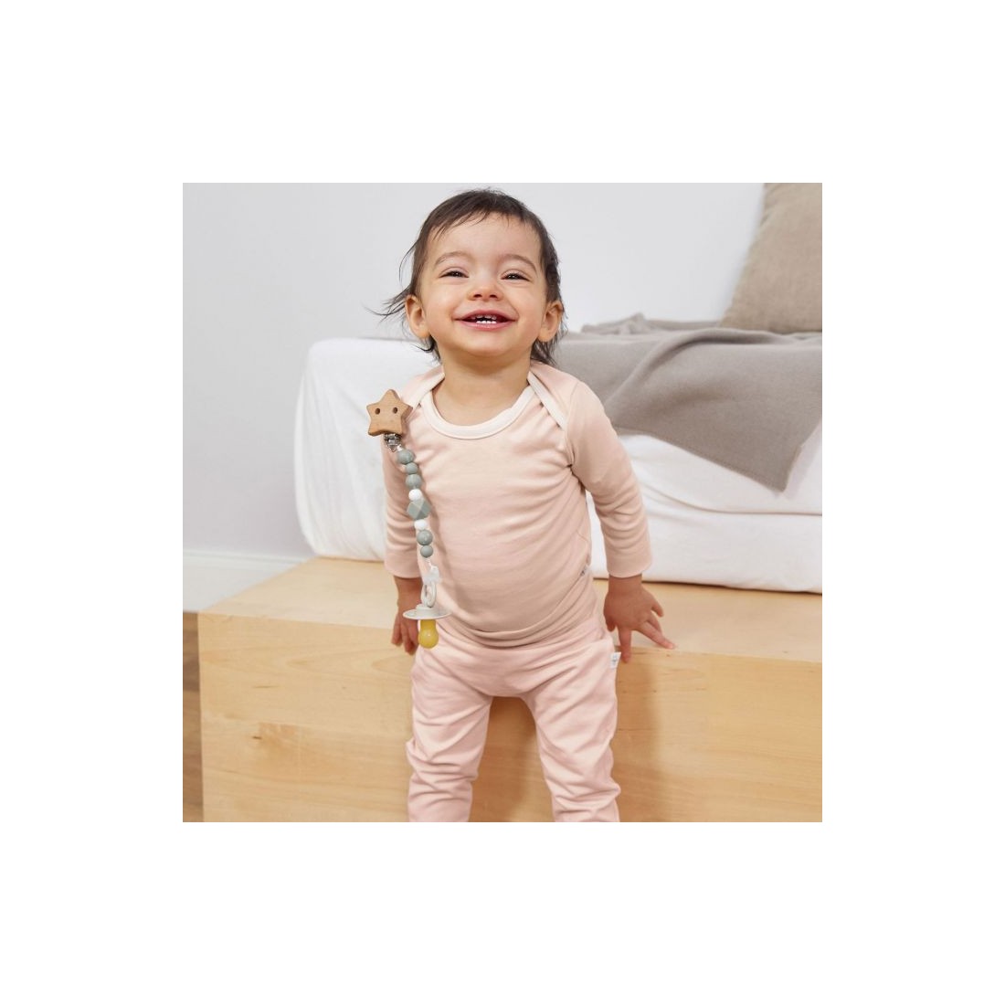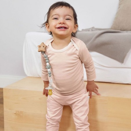 Sans BPA, l’attache-sucette se compose d’un clip en bois avec fermeture métallique, d’une chaîne en silicone souple et d’un anneau en silicone permettant de fixer facilement la sucette. Le motif étoile, associé à l’univers de la lune et du ciel, stimule l’imagination des tout-petits tout en restant discret et raffiné.