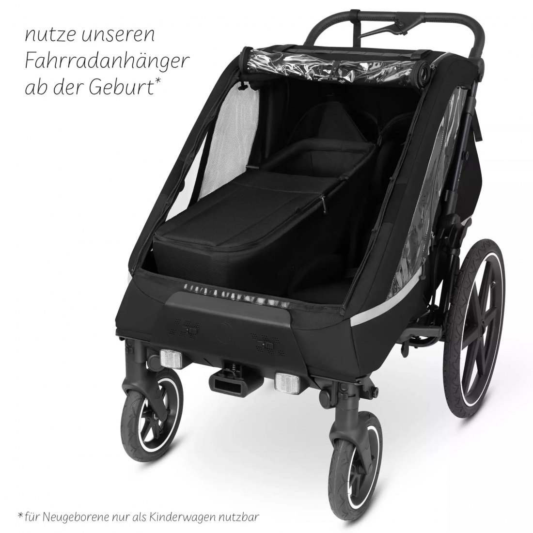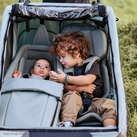 Pour les familles de jumeaux, la remorque Tour peut accueillir deux inserts côte à côte, offrant une flexibilité maximale et transformant la remorque en poussette double dès la naissance.